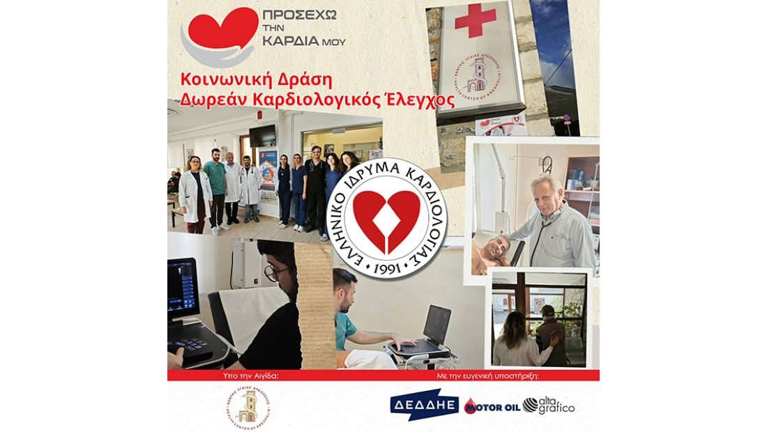 Το Ελληνικό Ίδρυμα Καρδιολογίας ολοκλήρωσε με επιτυχία την τριήμερη Κοινωνική του Δράση: «Προσέχω την καρδιά μου– Δωρεάν Καρδιολογικός Έλεγχος», στο Κέντρο Υγείας Αρεόπολης, υπό την Αιγίδα του, στις 19, 20 και 21 Νοεμβρίου 2025. Η δράση απευθυνόταν στους κατοίκους της Αρεόπολης και των γύρω περιοχών – χωριών, με στόχο τη δυνατότητα πρόσβασης όλων στον τακτικό ιατρικό έλεγχο της υγείας της καρδιάς τους, ειδικά όσων ανήκουν σε ευπαθείς ομάδες.